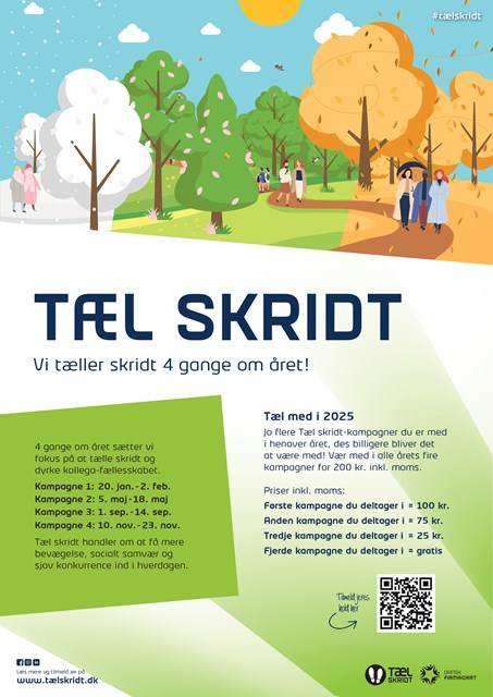 Tæl Skridt er en landsdækkende kampagne, der giver dig mulighed for at dyrke sammenholdet, få mere bevægelse og sjov konkurrence ind i arbejdsdagen.