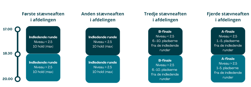 Disse afdelinger har hver to indledende runder og to slags finaler (OBS: 2. afdeling er lavet om til kun én indledende runde og én finaleaften).